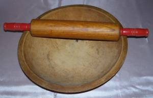 VINTAGE EARLY WOODEN MIXING BOWL AND TURNED, RED HANDLED ROLLING PIN, VG