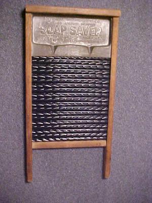 ANTIQUE BLUE PORCELAIN ENAMEL SOAP SAVER WASHBOARD WITH METAL TOP WOOD BACKING
