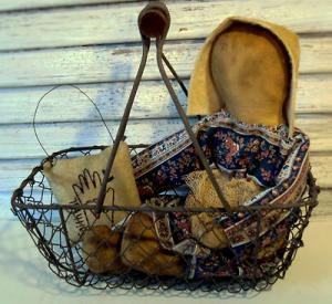 PRIMITIVE FOLK ART HANDMADE HANDCRAFTED PRAIRIE ORNIE DOLL CHICKEN WIRE BASKET