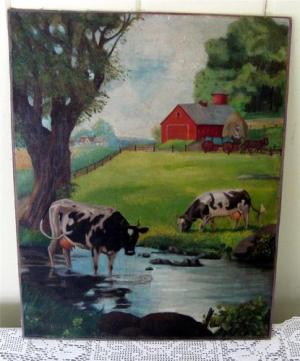 Antique Primitive Oil on Board Farm Scene-Cows at the Water's Edge