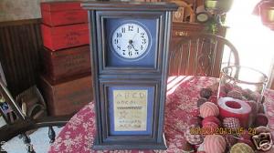 TALL COUNTRY PRIMITIVE MANTEL OR WALL CLOCK W/STITCHED SAMPLER UNDER GLASS