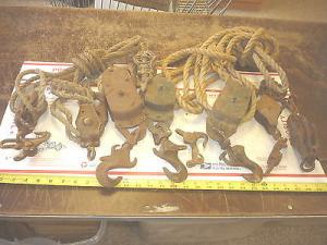 BOX OF OLD ANTIQUE + FARM & RANCH ROPE FENCE STRETCHER PULLEY TOOLS