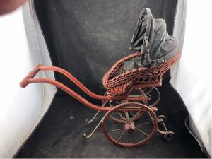 ANTIQUE VICTORIAN BABY DOLL CARRIAGE BUGGY WOOD METAL SCROLL CANVAS FOLD CANOPY