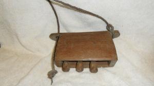 SUPER NICE EARLY CARVED WOODEN 3 GONG HANDLED 9" COW BELL SOMERSET CO. PA. NICE
