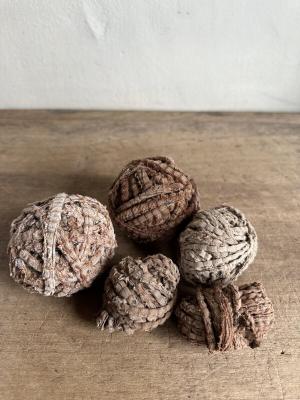 5 Old Artisan Made Antique Rag Rug Strip Balls Brown Textile SMALL
