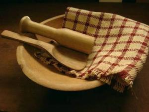 PRiMiTiVe~Old Wood BOWL GATHERING~Spoon~Masher~Red/Tan Check Coverlet Piece~PSAH