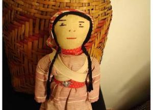 Old 1930's Cherokee Indian cloth Doll w/ Baby on back Feedsack clothes Antique