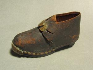 ANTIQUE 18th or 19thC WOOD AND LEATHER DUTCH CHILDS SHOE BRASS TRIM AND BUCKLE