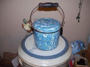 Antique Blue & White Small Swirl Graniteware Berry Bucket w/ Wooden Bail Handle