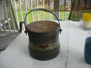 Vintage Antique Primitive Wood Firkin Sugar Butter Bucket with lid finger bands