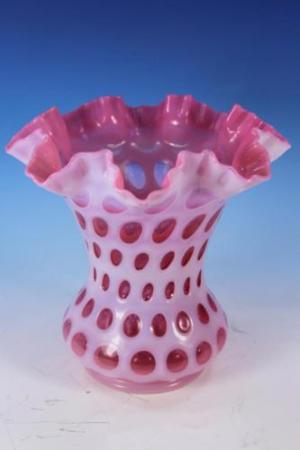 Vintage Fenton Art Glass Pink Cranberry Opalescent Coin Dot Ruffled Top Vase