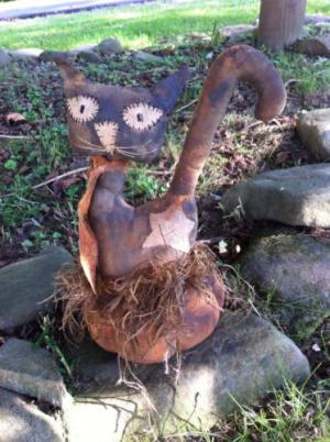 Primitive folk art Black Cat doll on pumpkin sitter cupboard tuck Fall Halloween