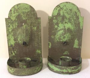 PRIMITVE ANTIQUE METAL GREEN TIN IRON HANGING CANDLE STICK HOLDERS OLD