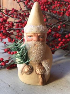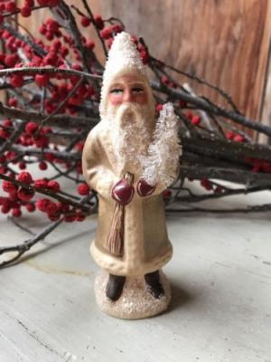 Black Forest Chalkware~ 5" Icy Winter Gold Folk Art Santa w/switch, feather tree