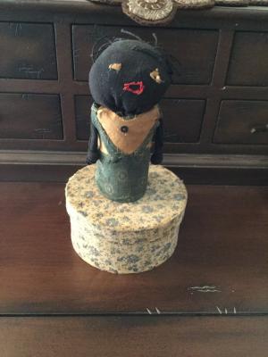 PRIMITIVE BLACK CLOTH BOTTLE DOLL AND FABRIC COVERED BOX