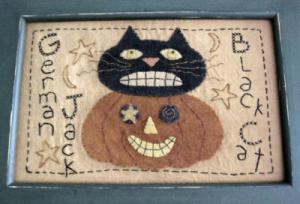 Primitive Halloween Penny Rug Stitchery Cat Pumpkin Jack Framed