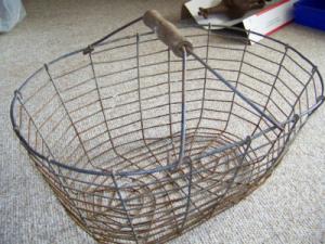 PRIMITIVE 19 X 12 X 13 FARM METAL EGG BASKET -- GREAT COLLECTABLE WOOD HANDLE