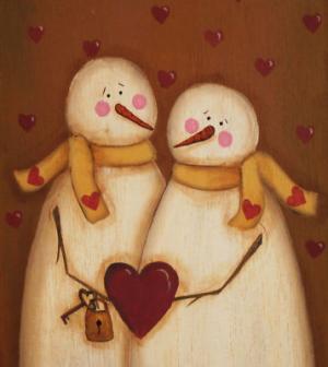 *~*PRIMITIVE*~* HP FOLK ART SNOWMEN COUPLE ~ HEART ~ VALENTINE ~ DOOR PANEL