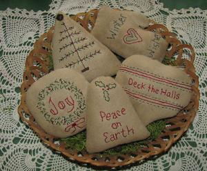 Primitive Set of 5 Osnaburg Embroidered Christmas Ornie/bowl fillers Dif Shapes