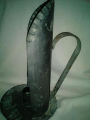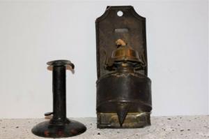 ANTIQUE TIN WALLMOUNT OIL LAMP - AND - TIN TOLEWARE CANDLESTICK W/ HOG SCRAPER
