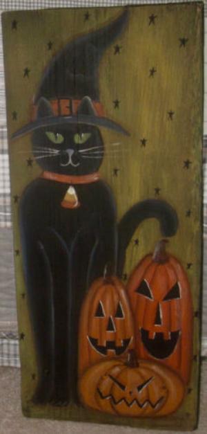 *~*PRIMITIVE*~* HP FOLK ART PRIM HALLOWEEN BLACK CAT *JACK-O-LANTERNS *~* BOARD