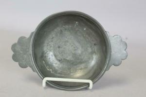 A GREAT EARLY 18TH C ENGLISH PEWTER DOUBLE HANDLE PORRINGER IN NICE OLD COLOR