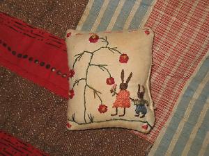 Primitive tiny Sampler Pillow~Mama Rabbit & Lil Boy ~ Folk Art Needlework