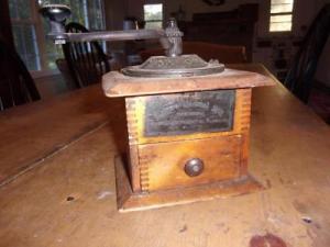 Antique Primitive Coffee Grinder w/ original label - iron & wood from estate #1