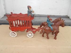 VINTAGE KENTON CAST IRON OVERLAND CIRCUS WAGON WITH 3 MEN,BEAR - 16 1/4" LONG
