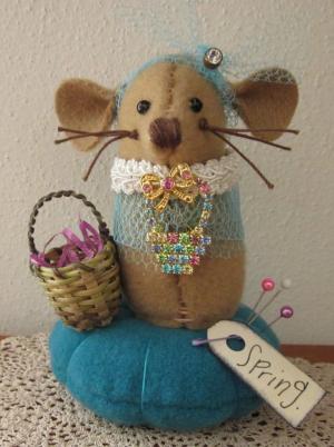 PRIMITIVE SPRING EASTER BASKET MOUSE MAKE DO PIN CUSHION RHINESTONE PIN PFATT