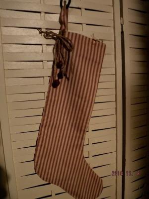 Primitive pioneer Christmas stocking bells red ticking stripe tea stain