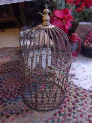 Primitive Vintage Whimsical Rusty Tin Wire Hanging Bird Cage W/ Red & Green Gems