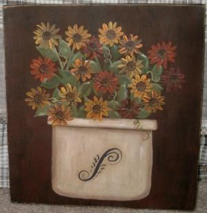 *~*PRIMITIVE*~* HP FOLK ART PRIM CROCK *~* SUNFLOWERS *~* FALL *~* BOARD