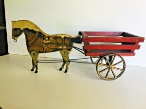 19TH Century Gibbs Toy Wooden, Tin, Iron Horse And Wagon