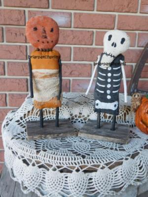 Primitive Pair of Halloween Skel & Pumpkin Doll Shelf Sitters Fall Decoration