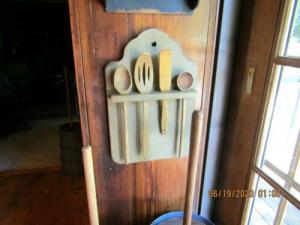 PRIMITIVE TOMBSTONE WOODEN UTENSIL BOARD TO HANG ON WALL W/OLD UTENSILS