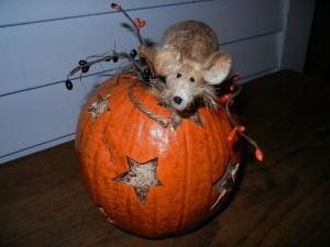 Primitive Halloween, Fall decor, pumpkin with "carved" stars, handmade mouse