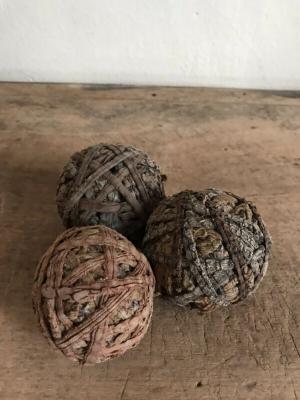 3 Handmade Early Antique BEST Brown Blue Rag Rug Balls Textile AAFA