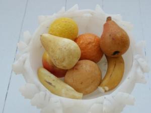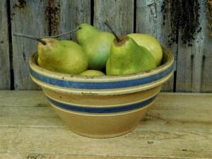 Antique Primitive Blue Banded Yellow Ware Bowl with Pears