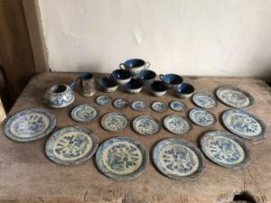 Sweet Set 28 WORN Childs Toy Tin Dish Set Blue White Plates Cups Dishes
