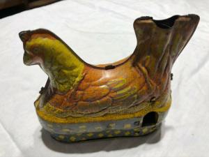 Primitive Antique Tin Chicken Toy 1930''s. Lays marble egg.