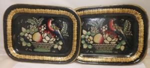 Rare Pair Antique Toleware Tin Paint Decorated Trays With Bird & Fruit Basket