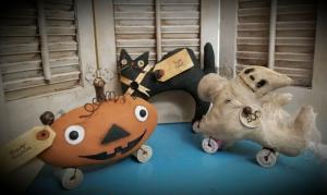 Primitive Halloween Pumpkin, Cat, & Ghost Doll Ornies ~ Wooden Thread Spools ~