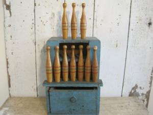 Ten Vintage Wood Child''s Toy Bowling Pins Original Blue Red Paint Bands AAFA