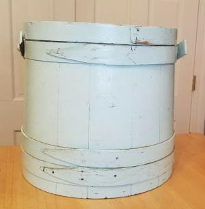 Antique Primitive Wood Firkin Orig Blue Paint Nailed Bands 12" Issue w/ Handle