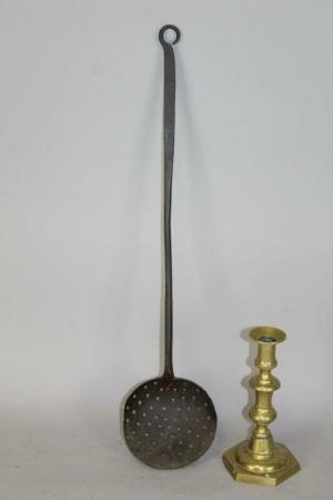 A VERY RARE 17TH C DUTCH WROUGHT IRON AND BRASS DIPPER WITH A PIG TAIL HANDLE