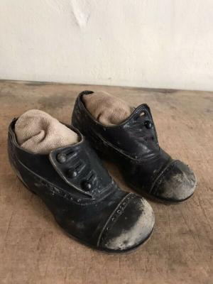 BEST Early Antique Childs Black Button Leather Shoes Worn Tattered Textile AAFA