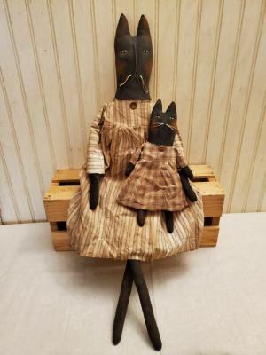 Primitive Grungy Tall Black Momma Kitty Cat Doll & Her Little Kitten