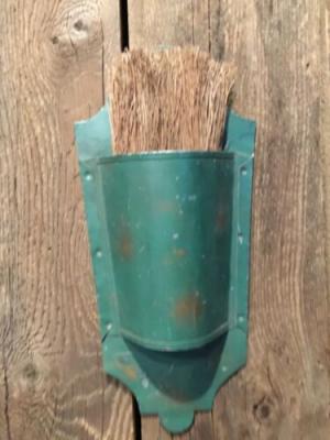 VINTAGE PRIMITIVE WHISK BROOM & PAINTED TIN HOLDER, WALL HANGER