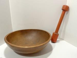 Antq Large Rimmed Wooden Dough Bowl w/ Double Head Wood Food Masher 18001899